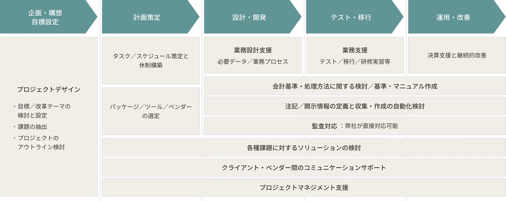 私たちは独立した会計プロフェッショナルファームとして、会計領域での高度な専門性と業績管理、管理会計制度および連結システム領域での豊富な経験の双方を有しており、IT/パッケージベンダーと協働し、また必要に応じて会計監査人とも協調し、クライアントが抱える課題・テーマに対して最適なソリューションを提供します。